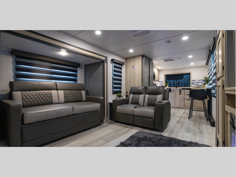 Each model is constructed with a vacuum bonded, welded aluminum structure, along with a PVC roof membrane, residential fiberglass insulation, and many durable construction materials. You will love the oversized opening windows in the living room, the walk-in shower in the bath, and the residential backsplash in the kitchen. The Climate Package helps extend your camping season and the Expedition Package includes many hassle-free amenities such as an outdoor shower, heavy duty slam latch baggage doors, and 4-point auto leveling!