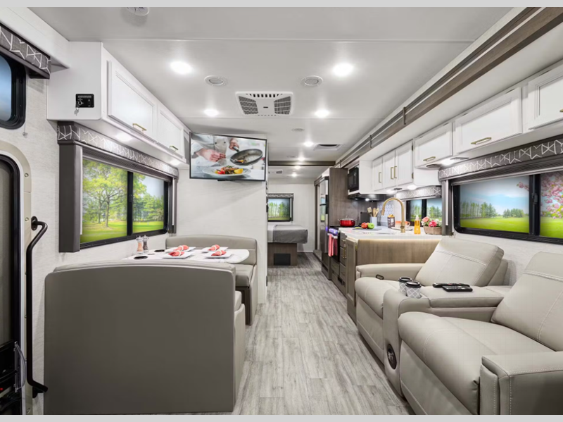 The cockpit is every pilot's dream with its 14" touchscreen dash radio with Bluetooth, backup and side view cameras, plus reclining and swivel Leatherette captain's chairs. The interior of the A.C.E is designed to make you feel at home with flat panel cabinets, spacious living quarters, and convenient kitchens that include everything you need while you're on the road.