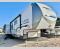 One look at this fifth wheel and you'll be sold! You can wake up each morning in the master bedroom that includes a custom king bed and a dresser with an ottoman. The front full bath has two bath sinks so you both can get ready at once, and you're going to love the walk-in wardrobe with a wrap-around hanging rod. A half bath includes a floating shelf with a hanging rod plus washer/dryer prep, giving you the option to make this a laundry room! The back of this unit is where you can cook meals with full kitchen amenities, dine at the kitchen island with four chairs, and relax on the theater seating and tri-fold sofa. A 50" TV and fireplace is also found here, complete with hidden storage behind for board games, movies, and snacks!